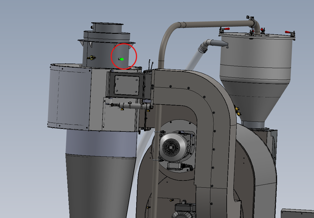 At the top of the cyclone, just below the stack hat